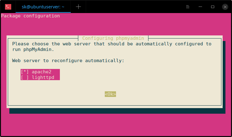 Now, select the web server that should be automatically configured to run phpMyAdmin. Choose the web server with UP/DOWN arrows and hit the SPACEBAR key. Once you chose the web server, you will see a * (star) symbol in-front of it. Hit the TAB key to choose OK and again hit ENTER key to continue.