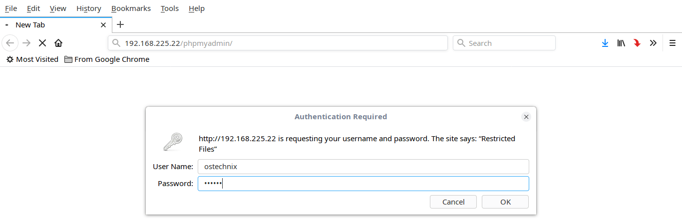 We have now added an extra layer of security to access phpMyAdmin web interface. From now on, whenever you try to access the phpMyAdmin web interface, you will prompted to enter the additional username and its password that you just configured in the previous step.
