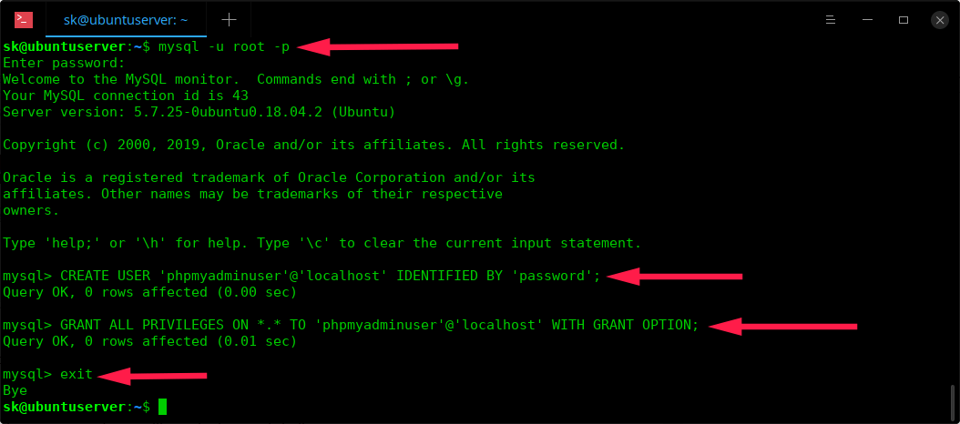 Enter the following command to create a new dedicated user for phpmyadmin: