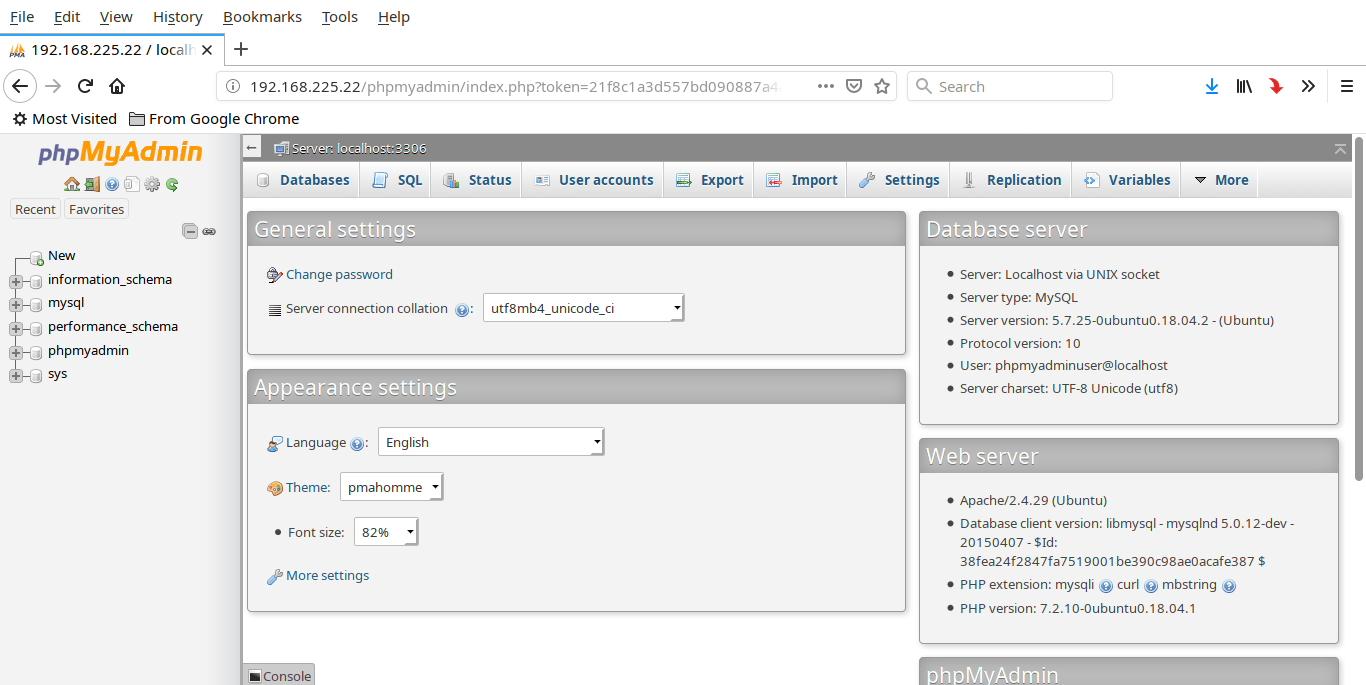 PhpMyAdmin dashboard