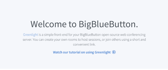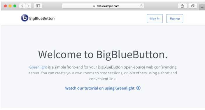 7 . You can open your BigBlueButton domain in your browser now. The Greenlight welcome page displays: