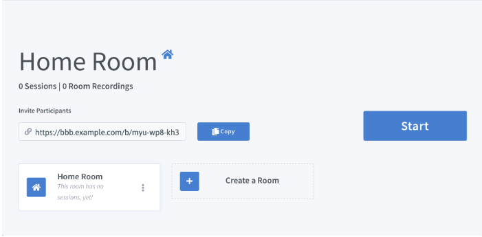 A Home Room is created by default for the new user. You can share the public link of the room for others to join it. Once you are ready, start the conference by clicking on Start. You will join the conference room with moderator privileges.