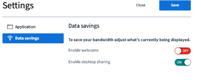 2 . Disable webcams in the Data Savings tab. Optionally desktop sharing can be disabled too for further bandwidth savings.