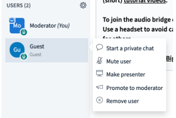 - Promote to moderator: Promote a guest to a moderator. The user will have the same privileges as the initial moderator.