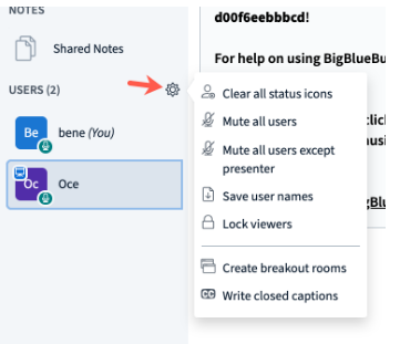 In addition, you have several other privileges available for the entire conference room. Click on the star wheel next to Users to display the options available to the moderator.