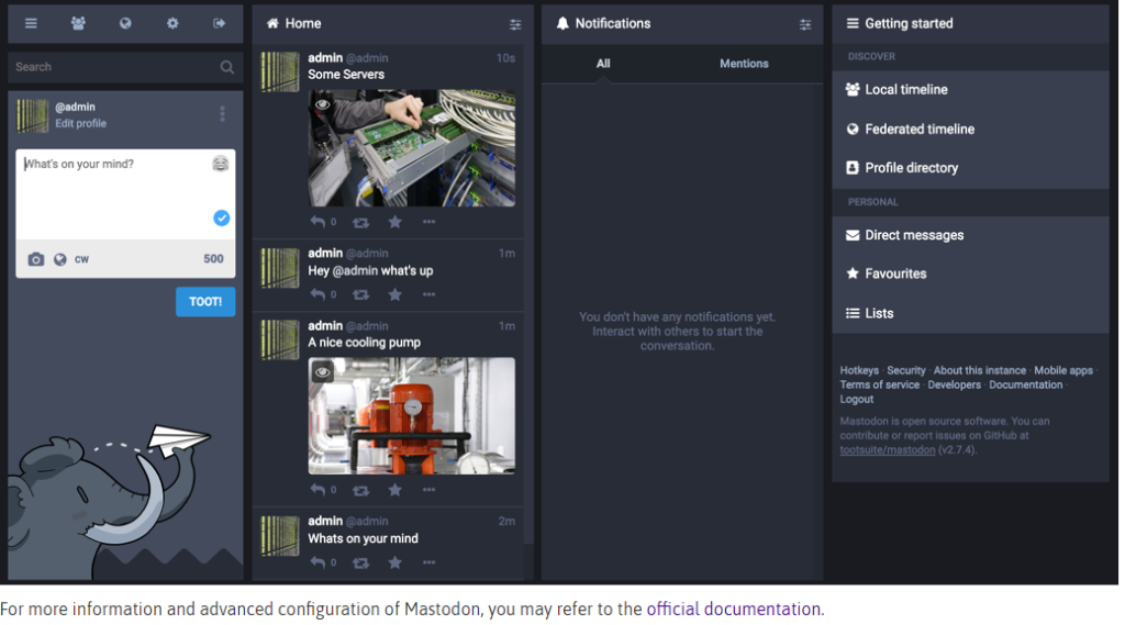 Mastodon is an open-source, self-hosted, social media and social networking service. It allows the hosting of your own instances which may have their own code of conduct, terms of service and moderation policies. There is no central server and Mastodon instances are connected as a federated social network, allowing users from different instances to interact with each other. The platform provides privacy features allowing users to adjust the privacy settings of each of their posts.