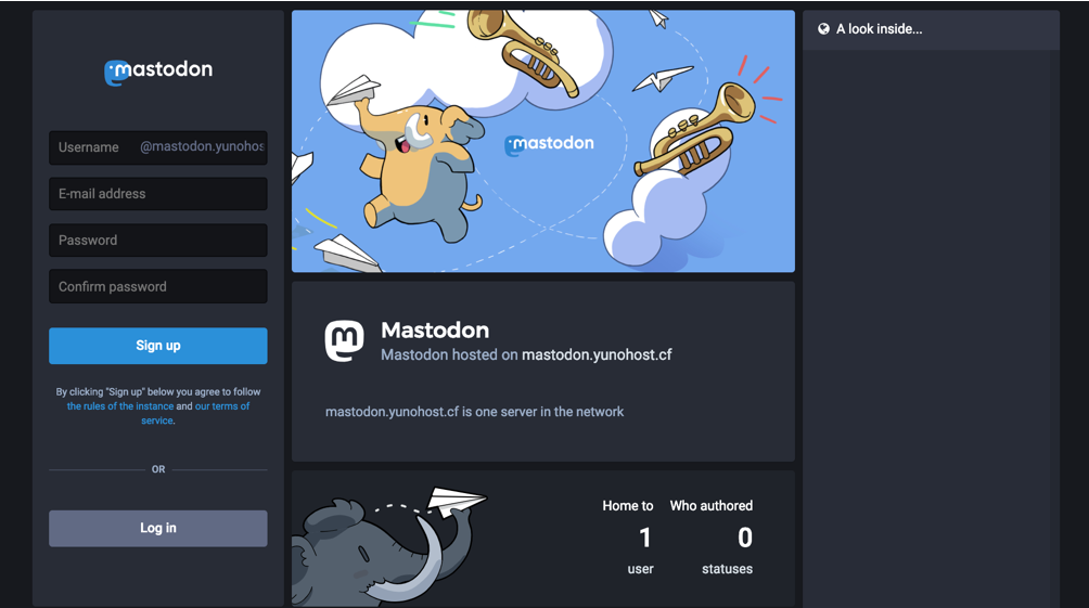 If everything is running, open a web browser and go to your domain name. You will see the home page of your Mastodon instance: